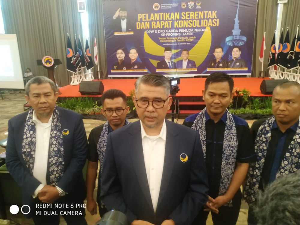 JAMBIUPDATE.CO, JAMBI- Ketua DPW NasDem Provinsi Jambi, Sy Fasha menghadiri pelantikan pengurus DPW Garda Pemuda NasDem di Swiss-belhotel, Sabtu (13/8). Dalam sambutannya, Walikota Jambi dua periode ini banyak berpesan kepada pengurus Garda Pemuda NasDem yang di nahkodai Alkes Purnama Putra.