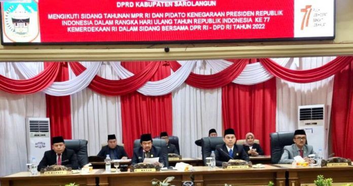 JAMBIUPDATE.CO, SAROLANGUN – Penjabat Bupati Sarolangun Henrizal, menghadiri rapat paripurna istimewa yang digelar oleh DPRD Sarolangun dalam rangka mengikuti sidang tahunan MPR-RI dan Pidato Kenegaraan Presiden RI dalam rangka Hari Ulang Tahun (HUT) Kemerdekaan RI yang ke-77 secara virtual melalui Live Streaming Youtube Sekretariat Presiden di Ruang Sidang DPRD Kabupaten Sarolangun, Selasa (16/08/2022).
