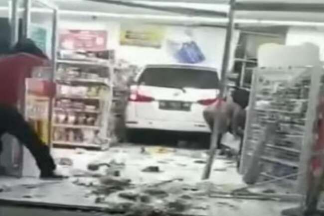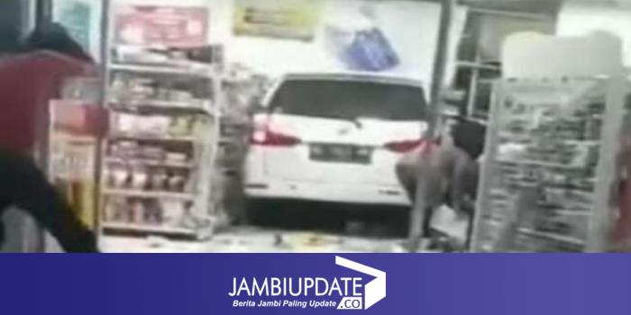 Mobil diduga hilang kendali dan menabrak minimarket yang sedang buka melayani pelanggan.