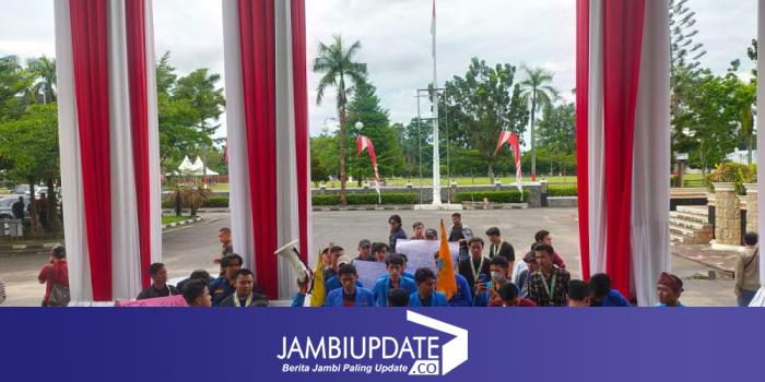 Mahasiswa membentangkan spanduk penolakan rencana kenaikan BBM yang dinilai mahasiswa tidak pro rakyat. Massa menuntut bertemu dengan Dewan Perwakilan Rakyat Daerah Provinsi Jambi.