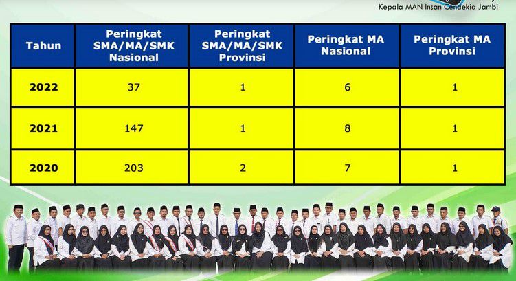 JAMBIUPDATE.CO, JAMBI - Kualitas MAN Insan IC sebagai madrasah unggulan di bawah naungan Direktorat Jenderal Pendidikan Islam Kementerian Agama Republik Indonesia tidak diragukan lagi. Saat ini MAN IC Jambi terus bergerak tumbuh dan mengembangkan berbagai sektor akademik. Hal ini dapat terlihat dari capaian prestasi akademik, hasil belajar serta sebaran alumni.