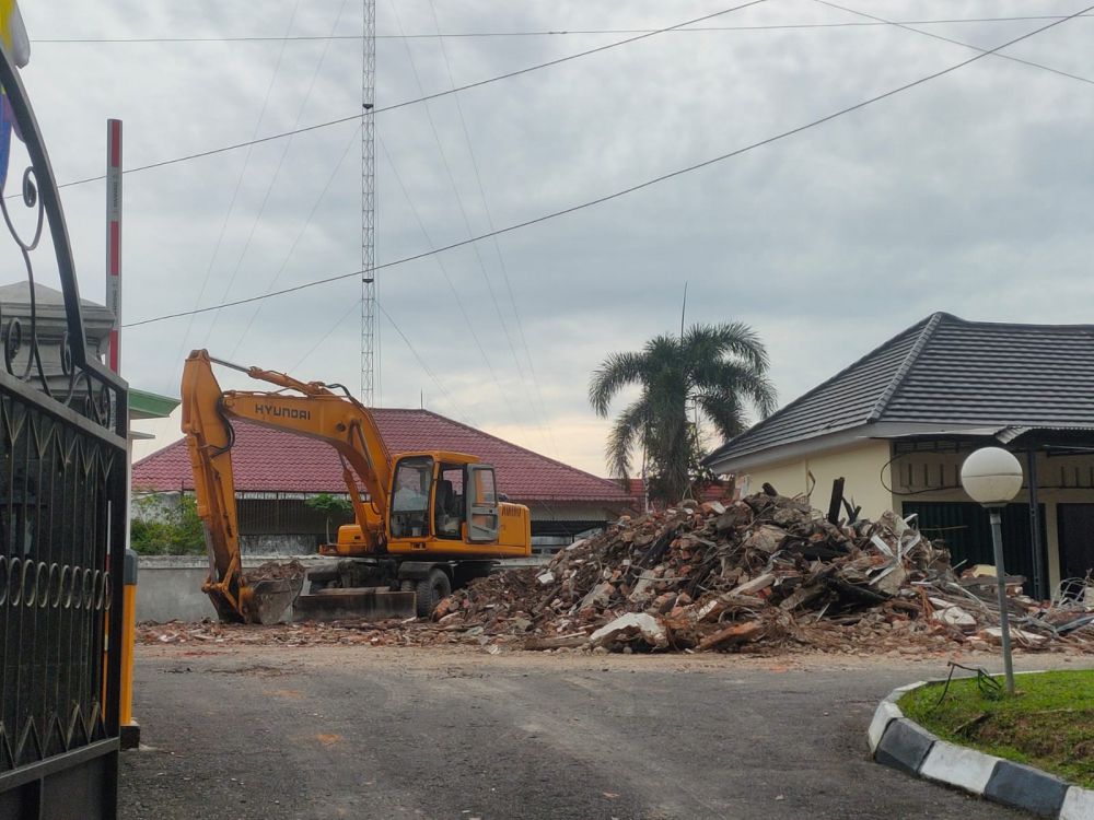 Tampak di lokasi, satu alat berat berada di depan rumdis untuk meratakan dinding dan atap yang sebelumnya hangus terbakar di kawasan Telanaipura, Kota Jambi ini.