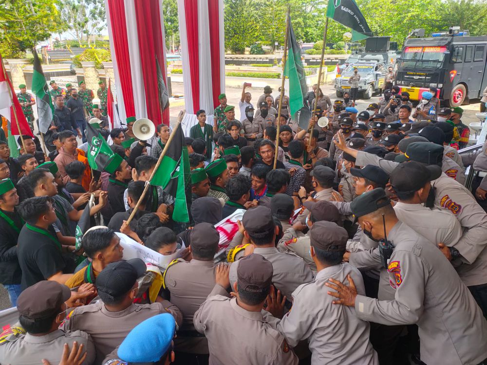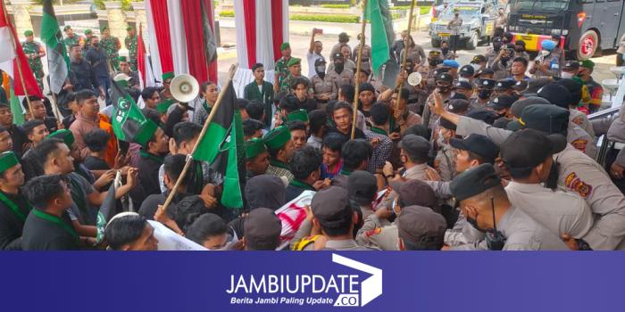 Massa menuntut bertemu Pimpinan DPRD Provinsi Jambi untuk menyuarakan tuntutan. Namun mahasiswa tertahan oleh penjagaan aparat kepolisian. Aksi saling dorong tak terelakkan dan langsung terjadi di awal aksi.