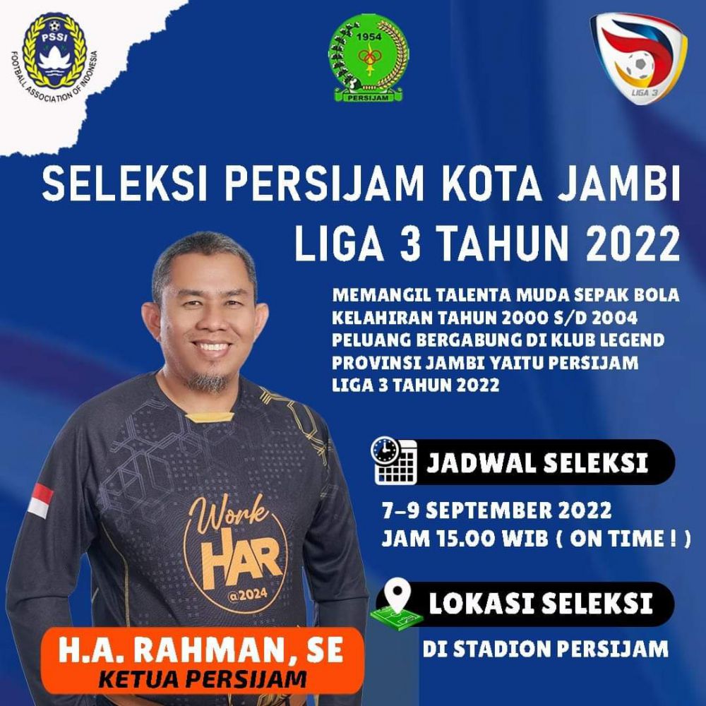 "Ayok, talenta muda sepak bola kelahiran dari 2000 sampai 2024 silakan ikut seleksi. Semoga, atlet-atlet yang lolos seleksi berpeluang bergabung di Persijam untuk menghadapi Liga 3," katanya.