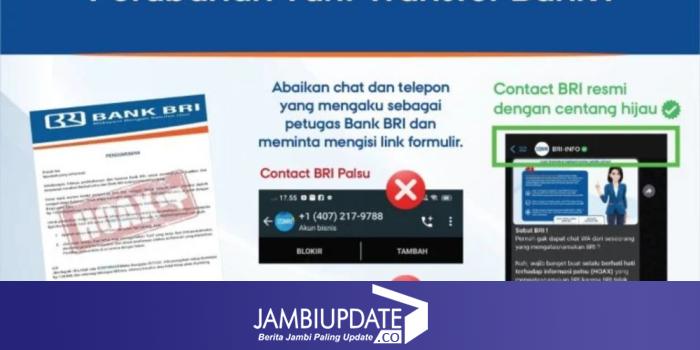 JAMBIUPDATE.CO, JAKARTA - Modus penipuan dengan mengatasnamakan pihak perbankan masih beredar di masyarakat. Salah satunya adalah melalui beredarnya pesan singkat dari sumber yang tidak dapat dipertanggungjawabkan dengan mengatasnamakan BRI, pesan tersebut berisi informasi perubahan tarif transaksi menjadi Rp150.000 per bulan serta link pengisian data pribadi.