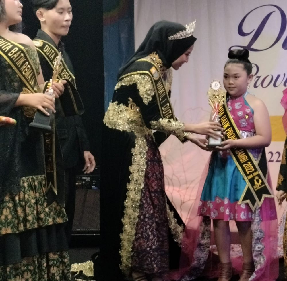 Sementara Duta Batik Remaja gelar terhormat diserahkan kepada Vanessa Ariesta (Kota Jambi) dan Pra Remaja Melodi Aprinisa Putri (Kota Jambi). Gelar Duta Batik Anak-anak milik Kota Sungaipenuh Dita Qayla Raisya dan untuk putra Raihan (Kota Jambi).