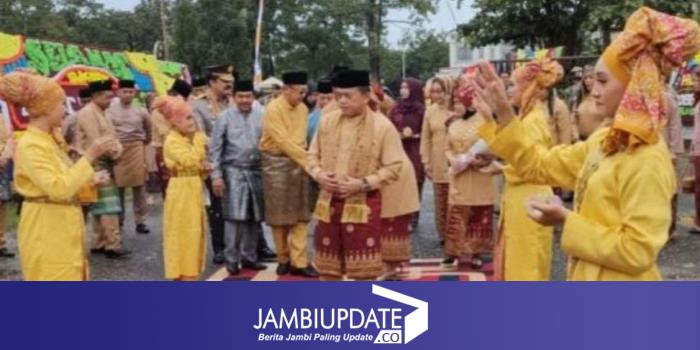Kedatangan Gubernur Al Haris di gedung DPRD Kabupaten Sarolangun disambut tarian persembahan dan pejabat bumi bumi sepucuk adat serumpun pseko.
