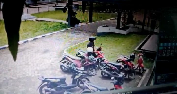 "Kejadiannya, pelaku lewat samping kemudian langsung ke sini. Niatnya pertama mau mencuri motor warna hitam tapi mungkin nggak jadi, akhirnya pindah ke motor satunya lagi dan dibawalah motor itu lewat depan kantor," ujarnya.