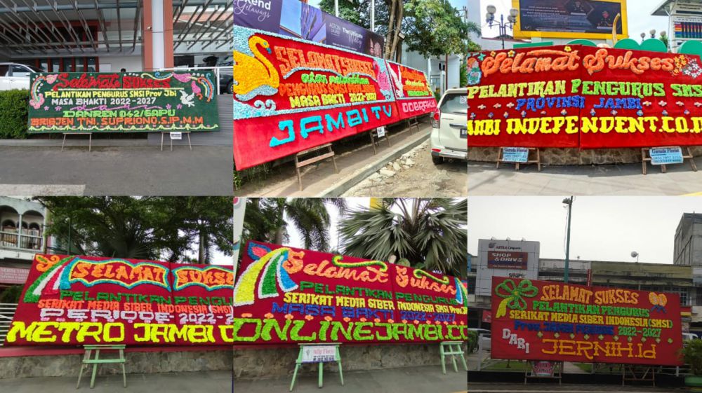 Pantauan di lokasi pelantikan SMSI Provinsi Jambi, terlihat karangan memadati area hotel hingga di Taman Gajah dan Tugu Pers Kota Jambi.