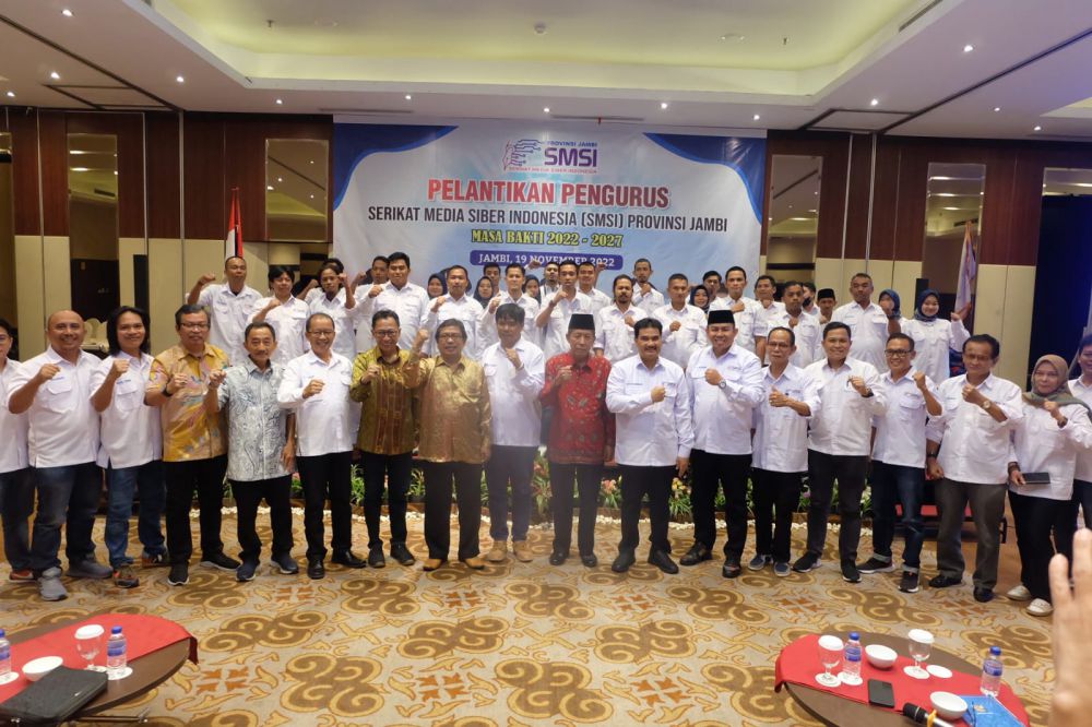 JAMBIUPDATE.CO, JAMBI- Pengurus Serikat Media Siber Indonesia (SMSI) Provinsi Jambi masa bakti 2022-2027 resmi dilantik oleh Wakil Ketua Umum SMSI, Yono Hartono di Aston Hotel, Kota Jambi, Sabtu (19/11).