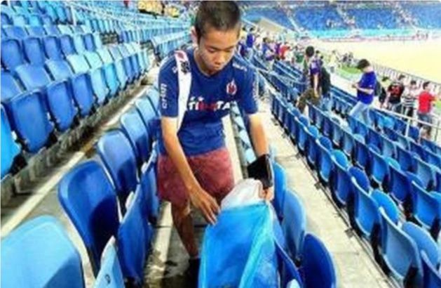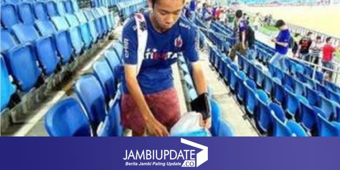 Para Suporter negeri Sakura itu terlihat mengumpulkan sampah bekas penonton yang berserakan di tribun.