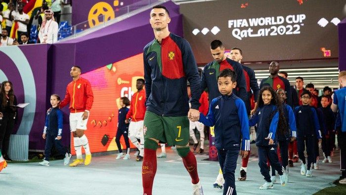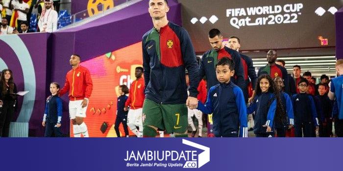 QATAR -- Cristiano Ronaldo menggandeng bocah yang ternyata berasal dari Indonesia dilaga Portugal menghadapi Ghana di Piala Dunia 2022.