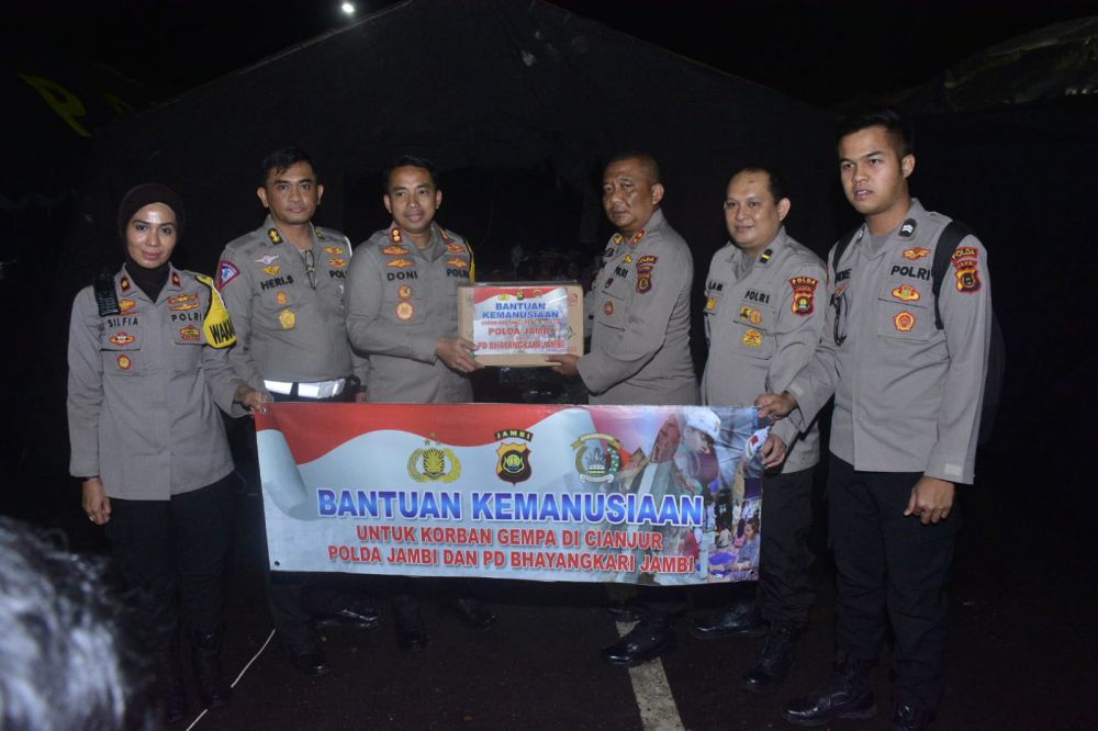 Tak tanggung-tanggung, perwakilan personel dari Polda Jambi diberangkatkan ke Cianjur untuk menyerahkan bantuan secara langsung ke posko pengungsian.
