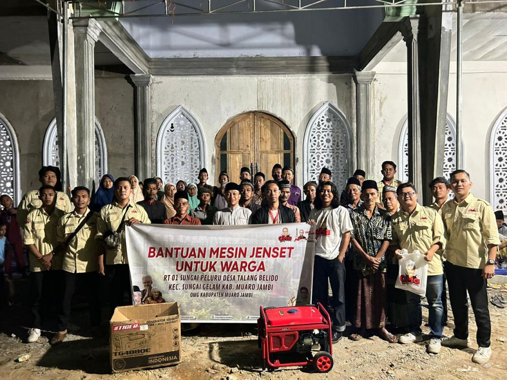 JAMBIUPDATE.CO, JAMBI - Relawan Orang Muda Ganjar (OMG) Provinsi Jambi memberikan bantuan mesin genset dan lampu kepada warga di Desa Talang Belido Kecamatan Sungai Gelam, Kabupaten Muaro Jambi, Provinsi Jambi.