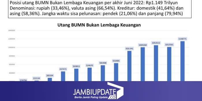 JAMBIUPDATE.CO, JAKARTA — Ekonom senior Awalil Rizky membeberkan data utang BUMN Bukan Lembaga Keuangan per akhir Juni 2022 sebesar Rp1.149 Triliun dengan denominasi rupiah (33,46%) dan valuta asing (66,54%).