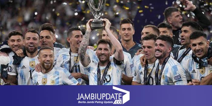 iklan Pemain Argentina merayakan keberhasilannya menjuarai Finalissima usai mengalahkan Italia dengan skor 3-0 pada Kamis (2/6/2022) dini hari.