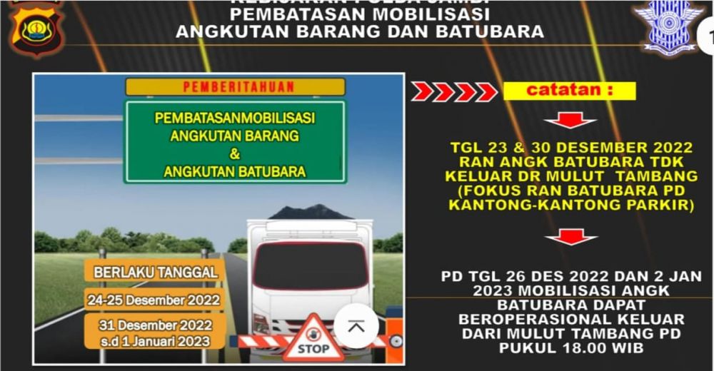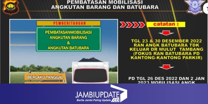 JAMBIUPDATE.CO, JAMBI - Menjelang perayaan Natal 2022 dan Tahun Baru 2023 (Nataru), Polda Jambi melalui Direktorat Lalu Lintas (Ditlantas) Polda Jambi lakukan pembatasan terhadap angkutan truk batu bara dan angkutan barang.