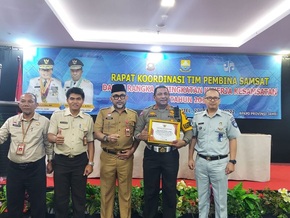Dalam kesempatan tersebut, Ditlantas Polda Jambi juga menerima penghargaan dari Gubernur Jambi Al Haris, yang diserahkan langsung oleh Sekda Provinsi Jambi Sudirman.