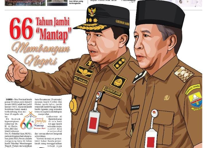 JAMBIUPDATE.CO, JAMBI – Usia Provinsi Jambi genap 66 tahun pada Jum'at 6 Januari 2023 (sejak hari jadi 6 Januari 1957) . Sepucuk Jambi Sembilan Lurah makin berkembang dan melesat di segala sektor.