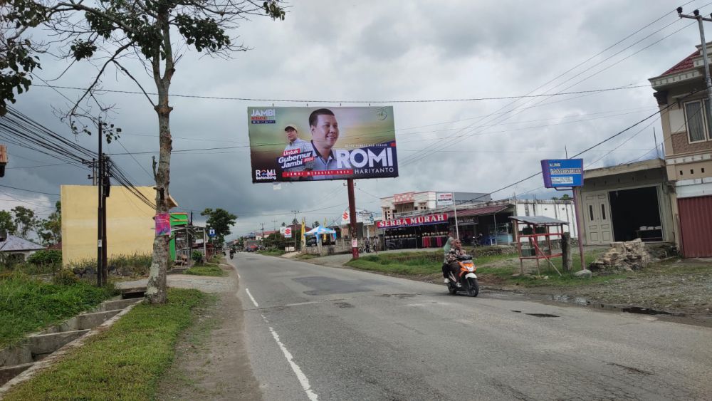 Tampak baliho ukuran besar timbal balik dengan bergambar Romi Haryanto dengan tulisan "Jambi Merakyat" terpasang kokoh di jalan Muradi Desa Sungai Liuk, Kecamatan Pesisir Bukit, Kota Sungai Penuh.