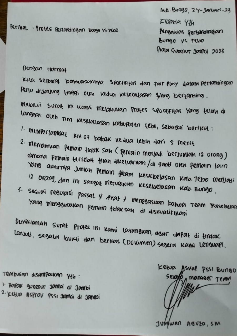 Kedua surat itu resmi dilayangkan oleh ASKAB PSSI Bungo yang ditujukan kepada Komisi Disiplin (Komdis) dan ASPROV PSSI Jambi.