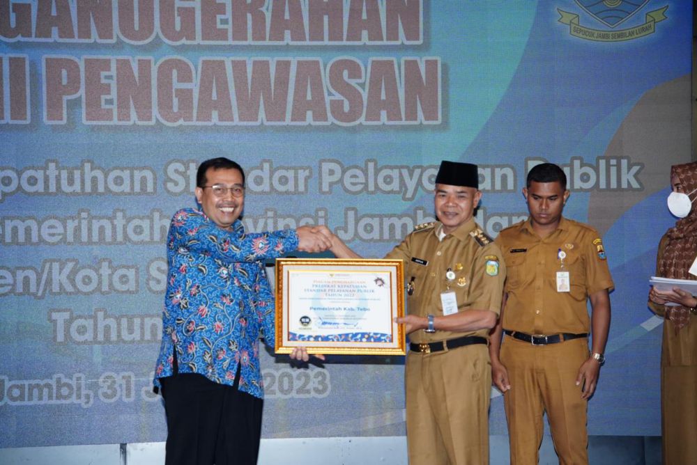 Penghargaan ini diberikan oleh Anggota Ombudsman RI, Muhammad Nadjib SH.MHum langsung kepada Kepala daerah Kabupaten Tebo Pj.H.Aspan, di Auditorium Rumah Dinas Gubernur Jambi, Selasa (31/1) kemarin.