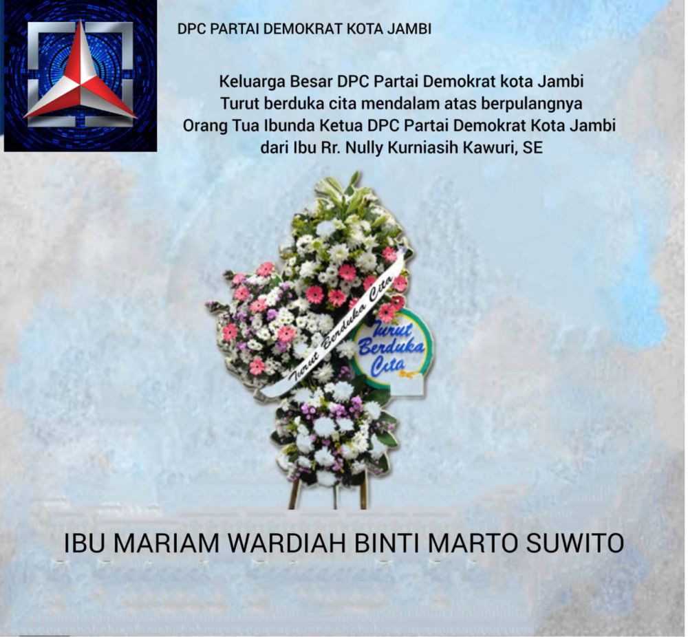 “Inanalillahi Wainnailaihirojiun. Ibu Mariam Wardiah orang tua dari Ketua DPC Demokrat Kota Jambi ibu Roro Nully Kurniasih Kawuri talah berpulang,” ujarnya.