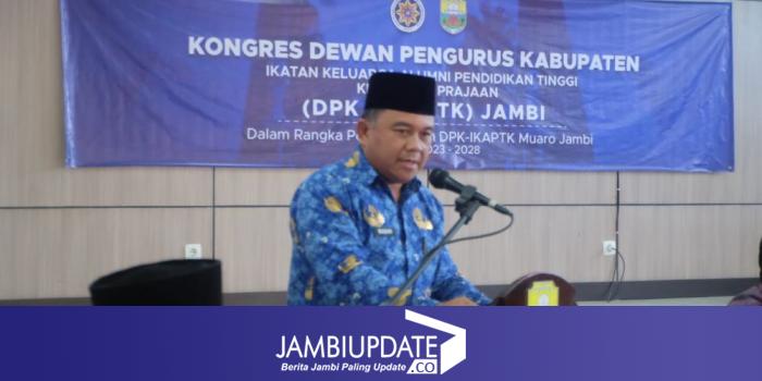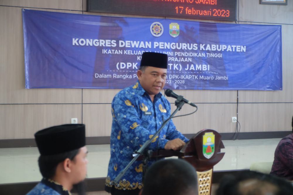 MUARO JAMBI- Sekretaris Daerah Kabupaten Muaro Jambi Budhi Hartono, S.Sos., MT membuka secara resmi Kongres Dewan Pengurus Kabupaten Ikatan Keluarga Alumni Pendidikan Tinggi Kepamong Prajaan (DPK-IKAPTK) Jambi dalam rangka pembentukan DPK-IKAPTK Muaro Jambi periode 2023-2028.