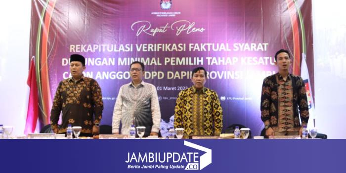 JAMBIUPDATE.CO, JAMBI- Sebanyak 7 bakal calon anggota DPD RI sudah dinyatakan memenuhi syarat (MS) minimal dukungan untuk maju di Pemilu 2024. Ini diketahui setelah Komisi Pemilihan Umum (KPU) Provinsi Jambi menggelar rapat pleno rekapitulasi verifikasi faktual di Hotel Rumah Kito, Rabu malam (1/3/2023).