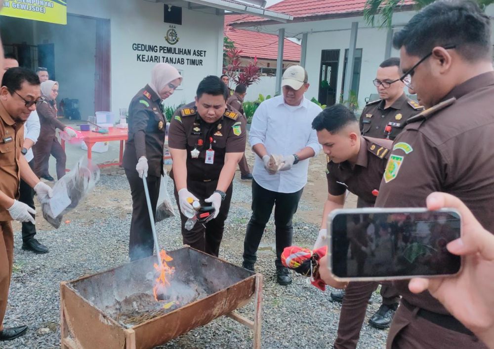 Pemusnahan tersebut dilakukan langsung oleh Kepala Kejari Kabupaten Tanjabtim, Yenita Sari, Sekda Tanjabtim, Sapril, Kasat Narkoba Polres Tanjabtim dan disaksikan Kasi Intel, Kasi Pidum, Kasi Pidsus serta jajaran Kejari Kabupaten Tanjabtim.
