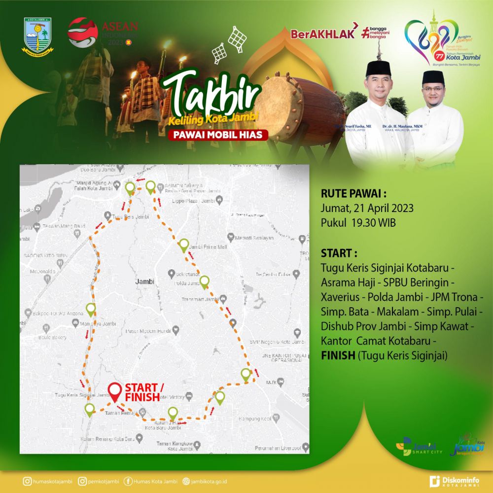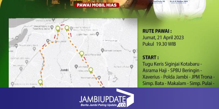 Diungkaokan Abu Bakar, untuk rute pawai yakni dimulai dari Tugu Keris Siginjai Kota Baru - Asrama Haji- SPBU Beringin - Xaverius - Polda Jambi - JPM Trona - Simp. Bata - Makalam - Simp. Pulai - Dishub Prov Jambi - Simp Kawat - Kantor Camat Kotabaru - dan finis di (Tugu Keris Siginjai).