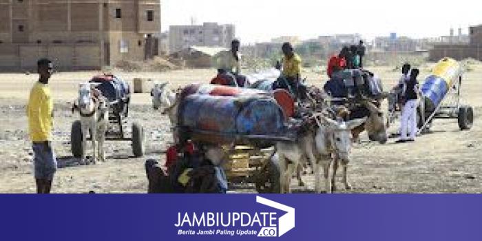 JAMBIUPDATE.CO, SUDAN- Warga mengisi drum dengan air di selatan Khartoum, Sudan, 22 April 2023, di tengah kekurangan air karena pertempuran di antara dua kelompok pimpinan jenderal yang bertikai. Ratusan orang tewas dan ribuan lainnya terluka akibat pertempuran itu.