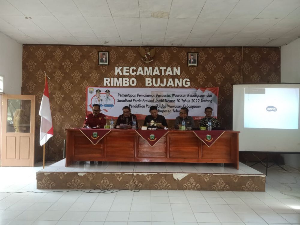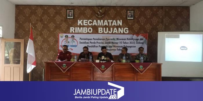 JAMBIUPDATE.CO, TEBO- JAMBIUPDATE.CO, JAMBI- Kegiatan sosialisasi Pemantapan Pendidikan Pancasila dan Wawasan Kebangsaan Tahun 2023 yang digelar oleh Badan Kesatuan Bangsa dan Politik (Kesbangpol) Provinsi Jambi berlanjut ke Kecamatan Rimbo Bujang, Kabupaten Tebo, Jumat (19/5).