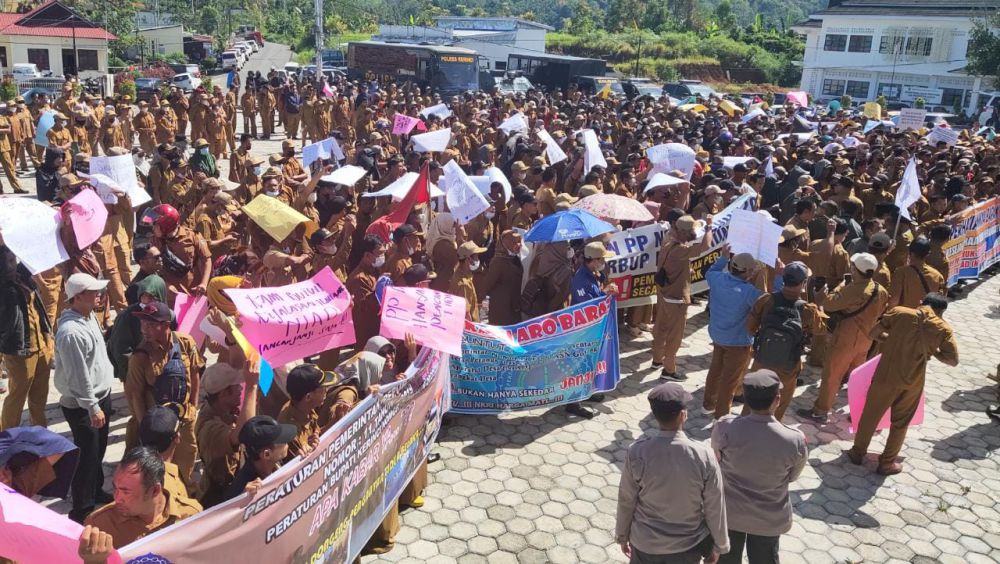 JAMBIUPDATE.CO, KERINCI- Ribuan perangkat desa yang tergabung dalam Persatuan Perangkat Desa Indonesia (PPDI) di 18 Kecamatan, Kabupaten Kerinci melaksanakan demo besar-besaran di kantor Bupati Kerinci Bukit Tengah Siulak, Kamis (25/05/2023).