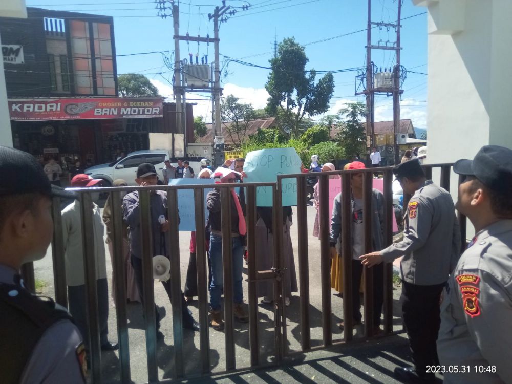 JAMBIUPDATE.CO, SUNGAI PENUH - Puluhan massa melakukan aksi demonstrasi di Pengadilan Negeri Sungai Penuh, Rabu (31/5/2023). Massa dari gabungan lembaga Swadaya masyarakat (LSM) peduli hukum dan keadilan di Kerinci, serta dari perwakilan tergugat pada perkara perdata nomor 68/Pdt.G/2022/PN-Spn mempertanyakan putusan hakim pengadilan negeri sungai penuh yang mengalahkan pemilik sertifikat tanah yang terbit sejak tahun 1984.
