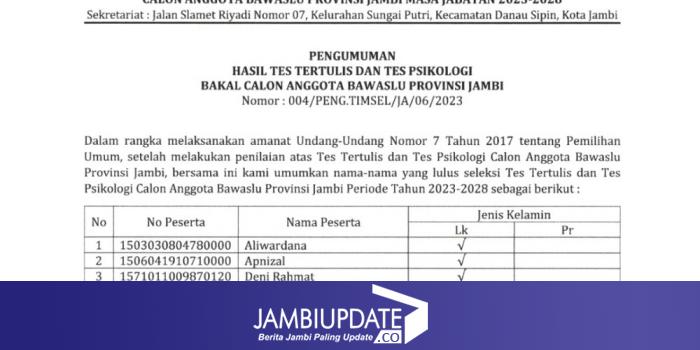 JAMBIUPDATE.CO, JAMBI- Tim seleksi (Timsel) sudah mengumumkan hasil tes tertulis dan tes psikologi calon anggota Bawaslu Provinsi Jambi periode 2023-2028.