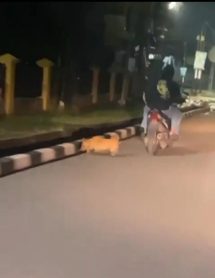 Dalam video yang beredar, terlihat kaki kanan anjing tersebut diikat menggunakan tali. Sedangkan dua orang pria diatas sepeda motor menarik anjing itu dengan santai.
