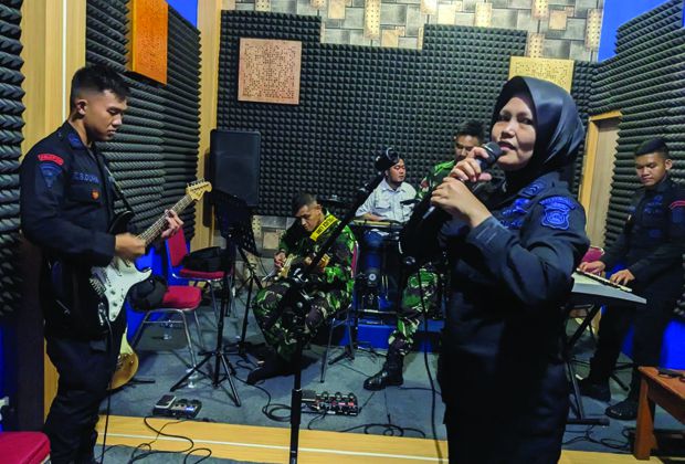 Keakraban dan kekompakan tampak saat Band Kartipala bermain alat musik yang bersama dimainkan personel Satbrimob Polda Jambi dan Prajurit Yonif Raider 142 Ksatria Jaya.
