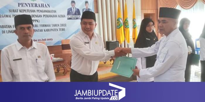 JAMBIUPDATE.CO, MUARATEBO- Sebanyak 271 orang tanaga honorer Guru di Kabupaten Tebo telah menerima Surat Keputusan (SK) pengangkatan sebagai Pegawai Pemerintah dengan Perjanjian Kerja (PPPK), yang diserahkan secara simbolis di aula Rumah Dinas Bupati Rabu (12/7) kemarin.
