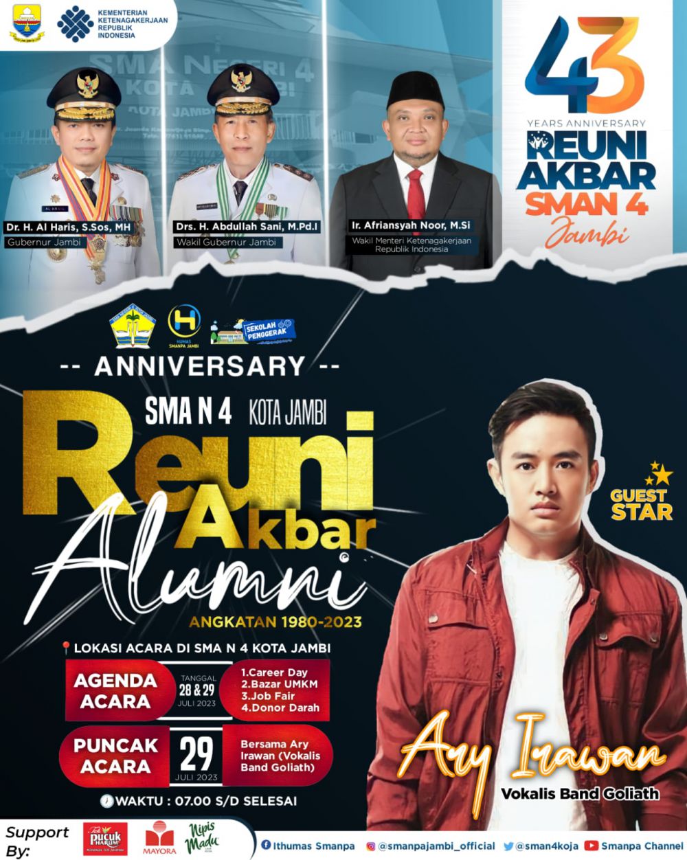 Tak hanya itu, tamu istimewa seperti Gubernur Jambi Al Haris dan Wagub Abdullah Sani dijadwalkan hadir. Serta akan hadir pula alumni kebanggaan SMAN 4 yang saat ini menjabat sebagai Wakil Menteri Tenaga Kerja RI dipastikan Afriansyah Noor dipastikan hadir pada reuni akbar ini.