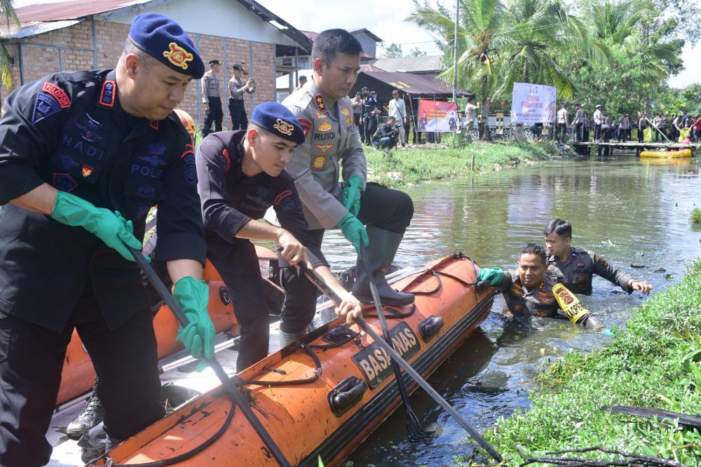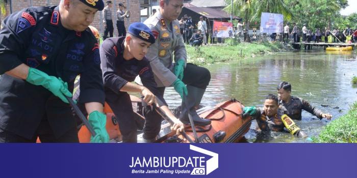 Pada kesempatan tersebut, Kapolda Jambi turun langsung ke aliran sungai untuk mengambil sampah-sampah yang menggenang dan menghambat aliran sungai.