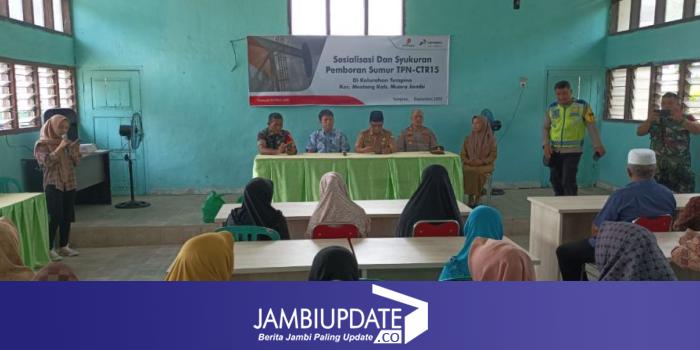 JAMBIUPDATE.CO, JAMBI – Kontraktor Kontrak Kerja Sama (KKKS) Pertamina EP Field Jambi menggelar sosialisasi dan syukuran Tajak Sumur Eksplorasi TPN-CTR15 di Aula Kantor Kelurahan Tempino Kecamatan Mestong Kabupaten Muaro Jambi Selasa, (05/09/23). Kegiatan ini sebagai penanda bahwa dimulainya pemboran sumur eksplorasi. Sosialisasi yang bertemakan "Sosialisasi dan Syukuran Pemboran Sumur TPN-CTR15" ini turut dihadiri oleh Camat Mestong, Kapolsek Mestong serta Danramil Mestong.