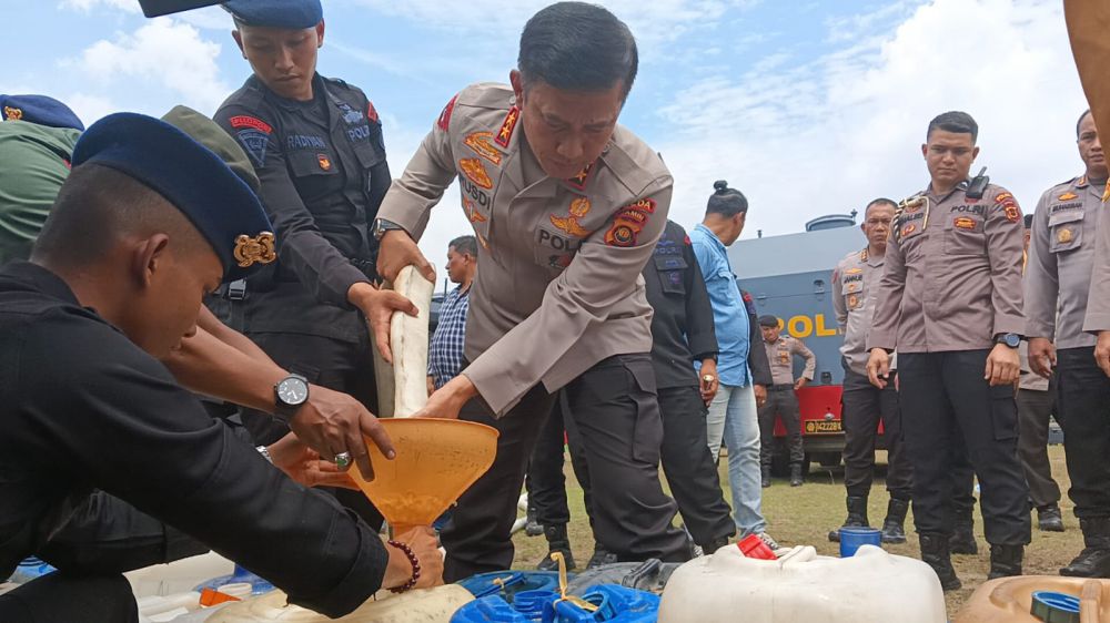 JAMBIUPDATE.CO, JAMBI - Polda Jambi kembali salurkan bantuan air bersih untuk warga yang terdampak kekeringan di Desa Sebapo kecamatan Mestong kabupaten Muaro Jambi, pada Selasa (12/9).