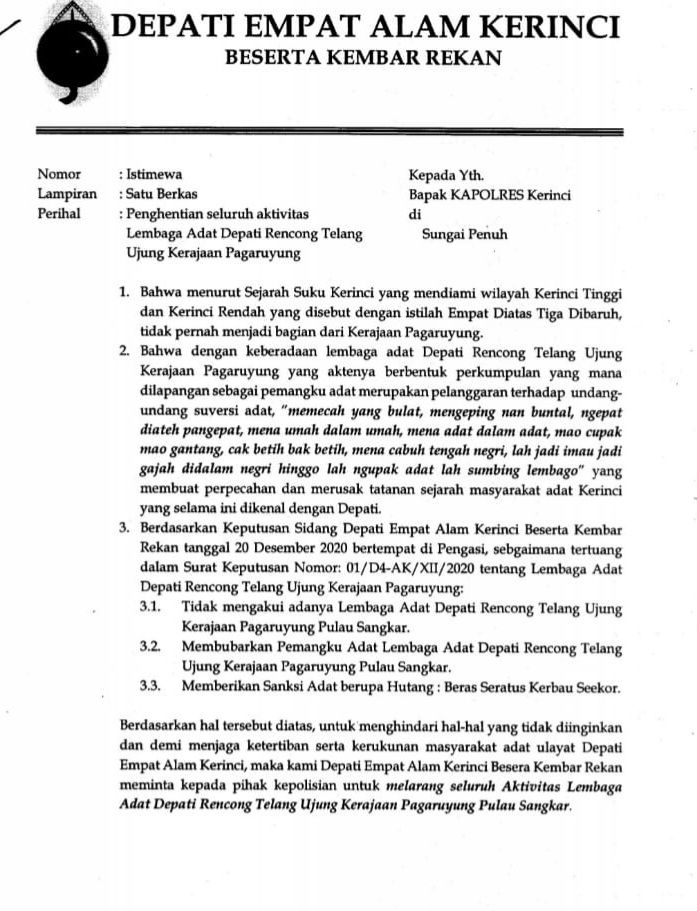 Data yang diperoleh Jambi Ekspres adpaun surat Depati empat alam Kerinci ke Kapolres Kerinci tertanggal 25 Agustus 2023 berisi beberapa permintaan. Berdasarkan Keputusan Sidang Depati Empat Alam Kerinci beserta Kembar Rekan 20 Desember 2023 di Pengasi.