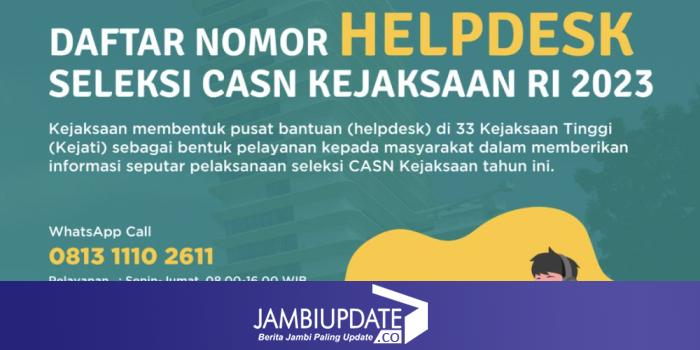 JAMBIUPDATE.CO, JAKARTA - Kejaksaan Republik Indonesia (RI) membuat terobosan dalam rangka Seleksi Pengadaan Calon Aparatur Sipil Negara (CASN) secara nasional. Untuk pelaksanaan sistem seleksi CASN (SSCASN) tahun ini, Kejaksaan membentuk pusat bantuan (helpdesk) di 33 Kejaksaan Tinggi (Kejati) sebagai bentuk pelayanan kepada putra-putri terbaik bangsa yang terpanggil untuk bergabung sebagai pegawai.