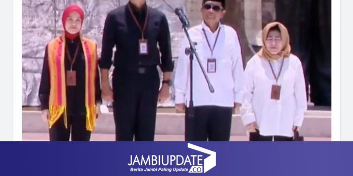 Mahfud MD saat menyampaikan sambutan di Tugu Proklamasi menggunakan pakaian putih dipadukan celana panjang hitam.