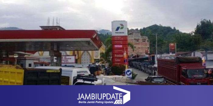 Sejumlah kendaraan terlihat antrean saat mengisi solar subsidi di SPBU di Kota Sungai Penuh.