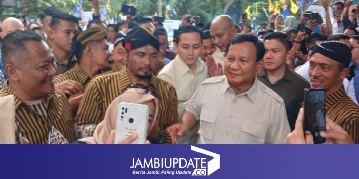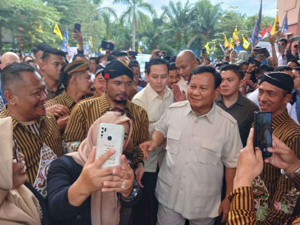 JAMBIUPDATE.CO, JAMBI- Calon presiden nomor urut 2 Prabowo Subianto menyapa pendukungnya dalam acara silaturahmi dan deklarasi paguyuban Pujakesuma Provinsi Jambi di Abadi Convention Center (ACC), Selasa (9/1/2024).