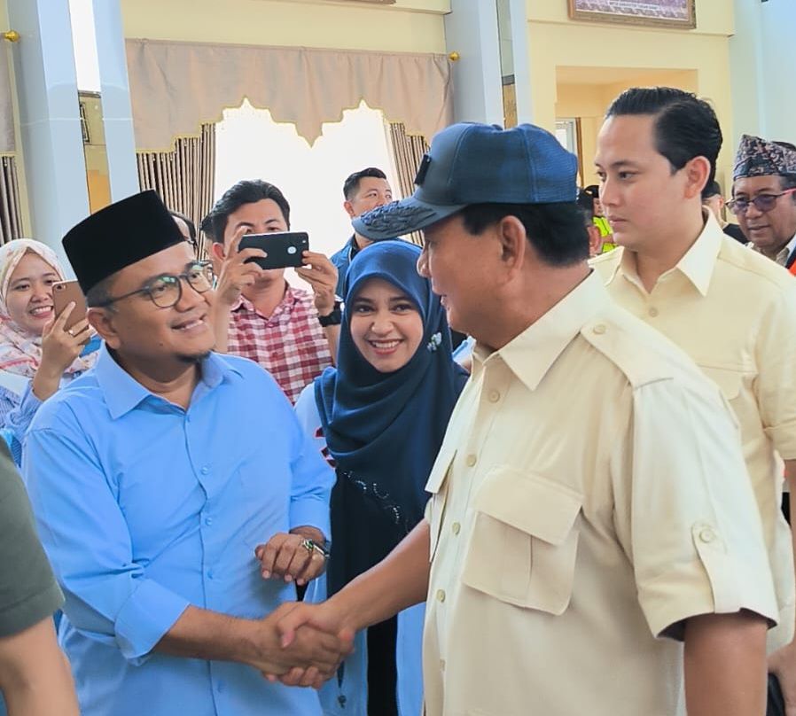 JAMBIUPDATE.CO, JAMBI- Calon Presiden (Capres) nomor urut 2 Prabowo Subianto, berkunjung ke Kota Jambi, Rabu (9/1/2023). Ia disambut Ketua Tim Kampanye Daerah (TKD) Kota Jambi dr Maulana saat tiba di Bandara Sultan Thaha Jambi.
