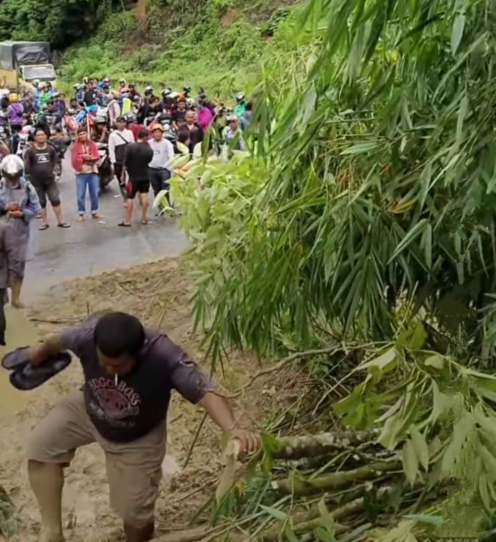 Informasi diperoleh material longsor berupa tanah, batu dan kayu menutupi jalan. Sehingga membuat kendaraan tak bisa lewat. Ratusan kendaraan nampak berhenti dilokasi tersebut.